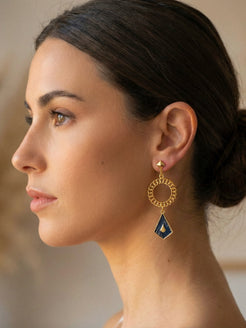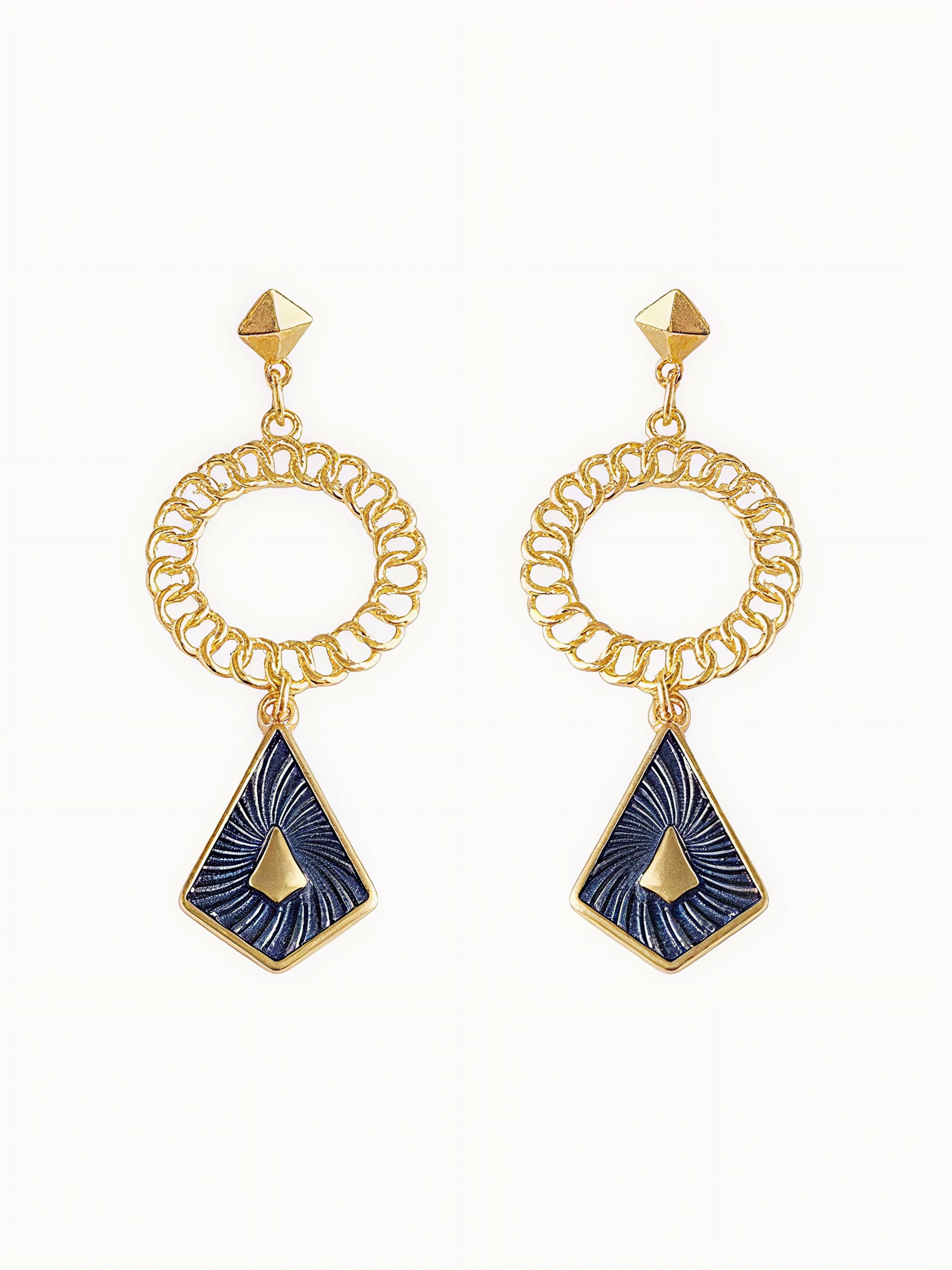 Este pendiente no deja indiferente a nadie. Su original diseño combina dos rombos, uno de ellos esmaltado en azul, que se unen por una espectacular corona de metal. Tres piezas que forman un pendiente muy favorecedor, diferente y cómodo.